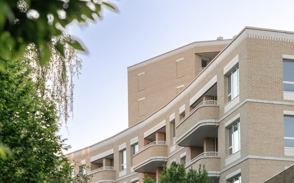 We designed refined, technically coordinated details enabling apartment ventilation ducts to terminate discreetly at window soffits, with careful coordination of masonry support systems and integrated fire-stopping elements. The façade showcases decorative brick patterns and glazed brick features, creating architectural interest and visual relief.