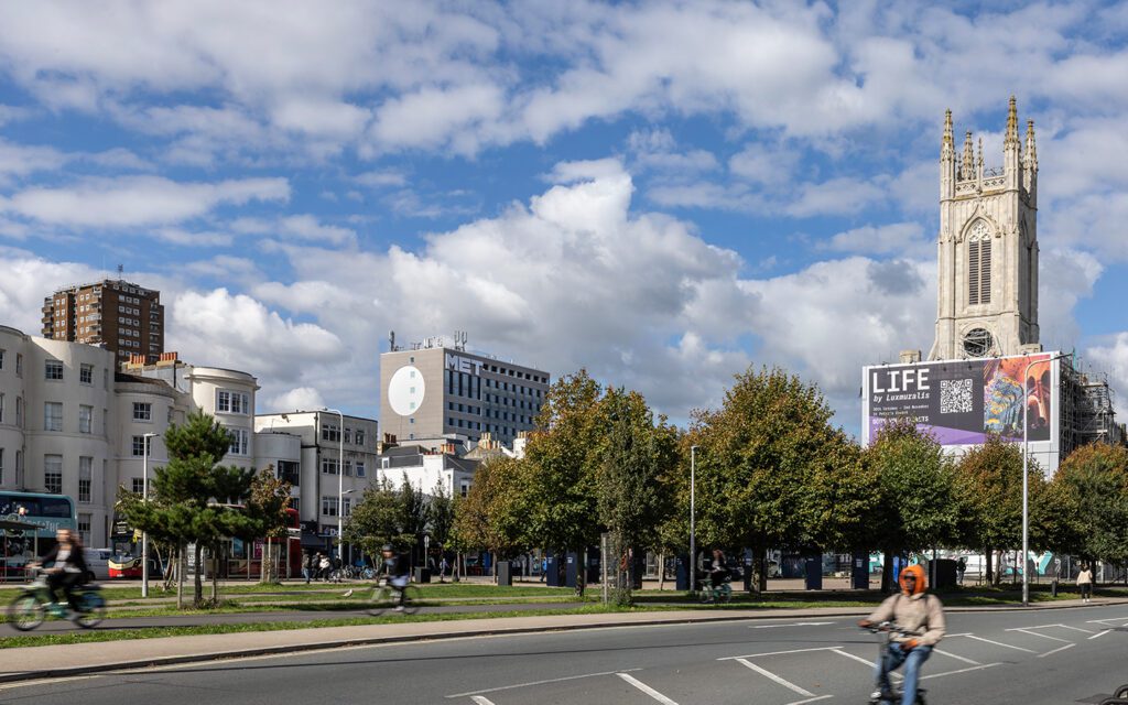 The second phase focused on transforming the 1970s Pelham Tower through comprehensive over-cladding. This addressed poor thermal performance and airtightness issues that had plagued the building since its construction, resulting in excessive heating costs in the winter and summer overheating. Our design introduced a striking visual portal on the south face, illuminated at night to reference Brighton’s historic churches.