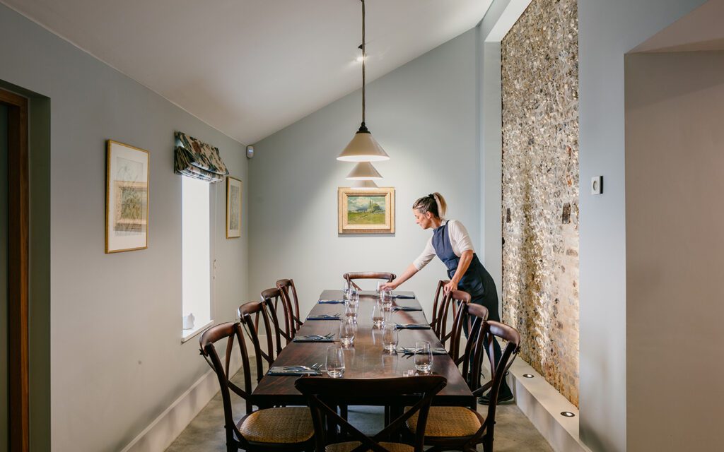 The restaurant now accommodates 60 covers plus an intimate 10-seat private dining room with exposed flint walls and a dedicated terrace.