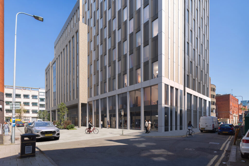 Located close to the Civic Centre and Cardiff Castle. The proposed scheme replaces an existing 1960s office building and will provide circa 600 PBSA beds and ground level commercial units.