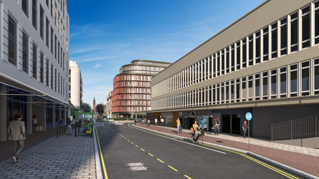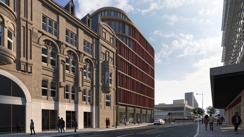 The proposal is for the redevelopment of Maple House, to provide 383 student beds, blended with a range of amenities and retail space. The existing building will undergo a major refurbishment and will see the existing five storey structure extended to ten. The new facade is a response to the site’s rich history and will see the building wrapped in a series of terracotta fins.